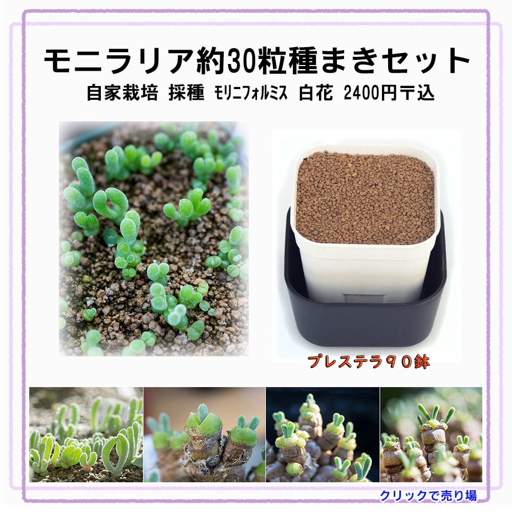 モニラリア モニリフォルミス 30粒の種蒔きセットです。 他社同等品と比較される場合は、①種子数 ②鉢の多ききさ ③種子に有機質が触れない 等を考察されてくださいませ。種子数は、親苗になる数に比例します。10粒も安価に販売いたしますが親になるのが1/3になる単純計算です。鉢の大きさは、懐の大きさ、苗の大きさに影響します。種子に有機質が触れないのは、腐敗が少ない事になります。 種子はカウントで30粒 プレステラ90 培養土 表土 底水トレー カラー栽培説明が入っています。播種の最適期は、初秋~中秋くらいで、1日平均気温が19度を下回る環境では、発芽しにくい、発芽しないです。 種まきした直後に防カビ殺菌剤と展着剤を混ぜた霧吹を行い、発芽頃にもう一度散布、以降半年は月に一度散布するのが良いです。冬の真菌は、本当に一夜で苗を全滅させるので、十分な注意をされてください。 配送は4種郵便で1個ごとになります。 初夏5月に蒔いて7月中旬~8月末に休眠させて秋に芽を出すことも出来ますが、お勧めは致しません。 モニラリアは、冬成長する苗ですので寒さには弱く、霜の降りないマイナス3度でも注意が必要ですので寒さの時には対策を行ってください。 モニラリアは、成長も早く強健な種類ですので、信金だけには注意されると大きくなりやすいです。秋蒔きは、5月~8月末までが休眠になりますので成長しない散水などで小苗を秋に目覚める様に管理されてください。 栽培説明は、同梱いたしますがメールで質問も受けていますのでお気軽にどうぞ!