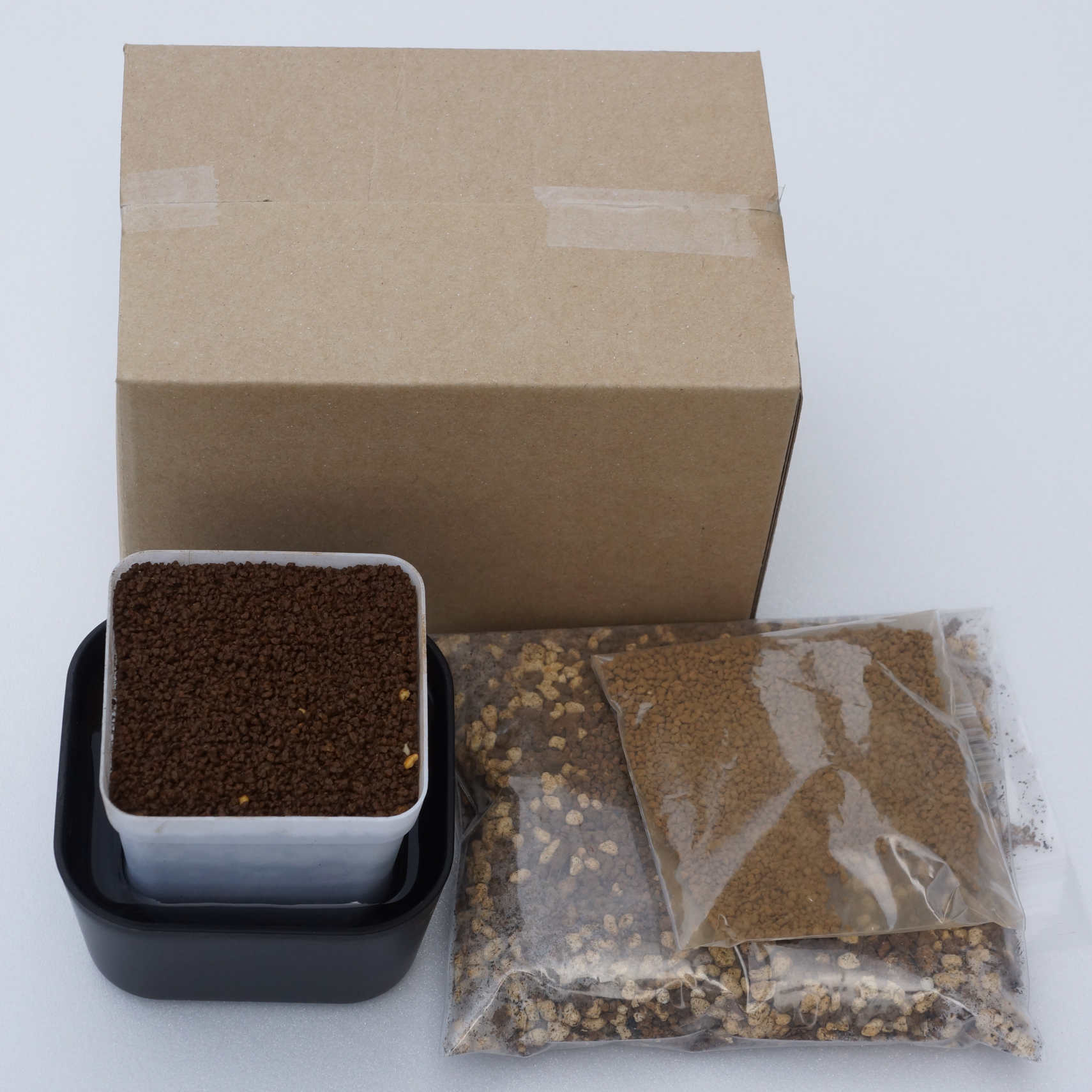 このキットに防カビ殺菌剤を散布し、5日目に2回目残布、以降殺菌剤は月1回半年散布、腰水で2ー3カ月ほど管理し、底面給水で表面が乾かない様に水を与えます。秋に蒔けば2-3月に脱皮し、5月に蒔けば9月頃に脱皮します。蒔くのは冬~5月上旬までは、良くないでしょう。初夏から蒔けますが、晩夏~秋まきをお勧めします。管理場所は、雨降り込まない半日以上の日照が有る場所で風通しが良い場所で5月から10月頭まで50%寒冷紗を使い温度上昇を避けます。